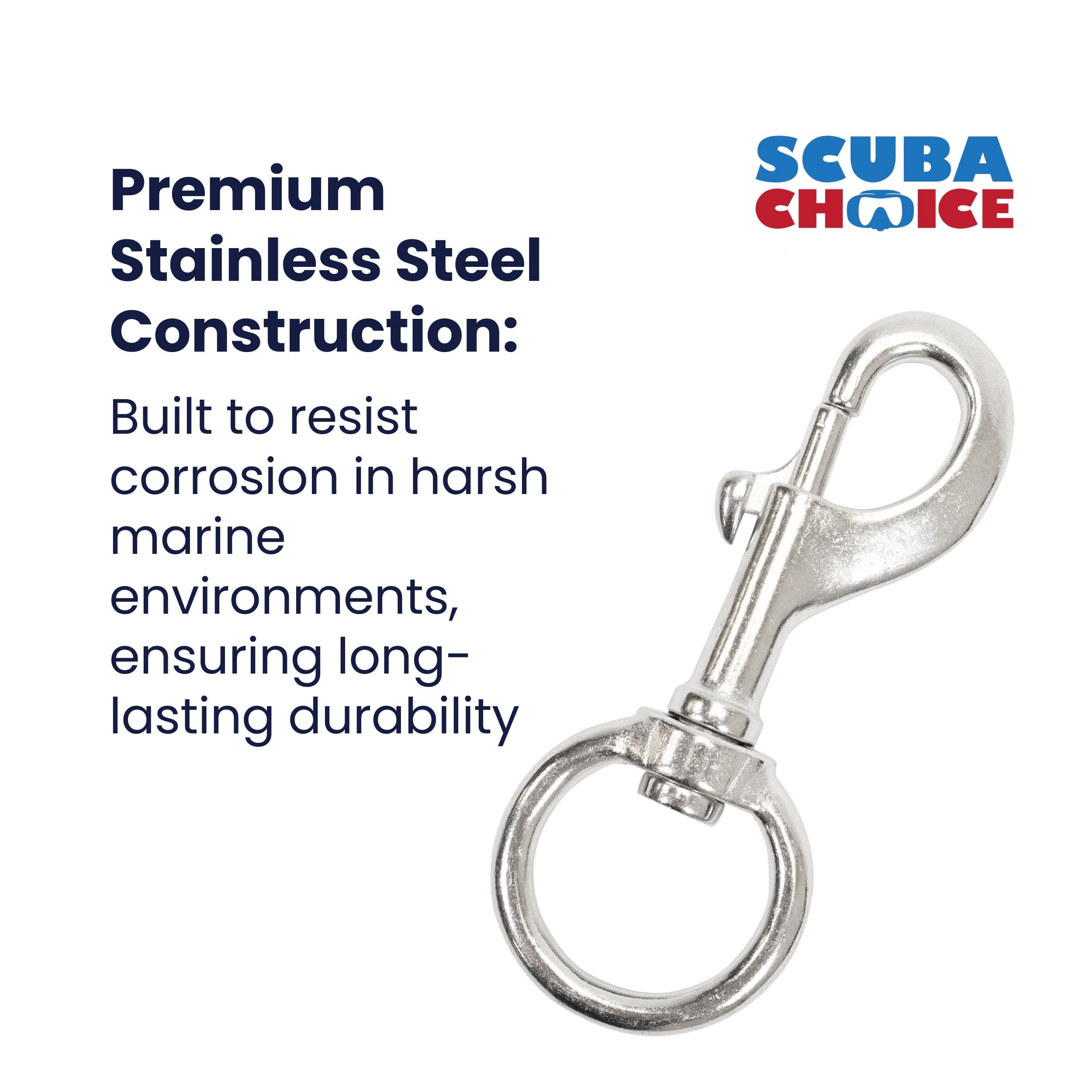 Its swivel-eye design ensures that attached items won't twist or tangle, making it ideal for connecting hoses, gauges, gear bags, anchor lines, or securing accessories to your BCD or belt. The spring-loaded snap mechanism provides reliable, one-handed operation, even with gloves.